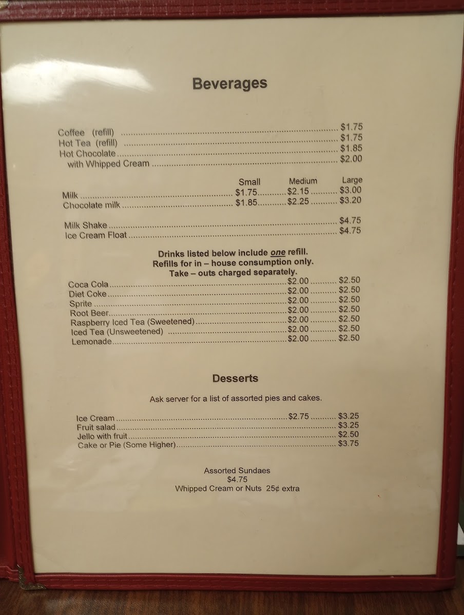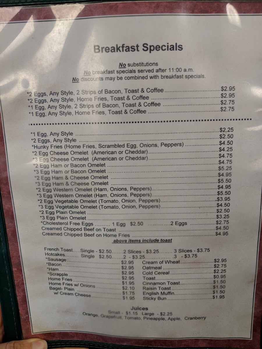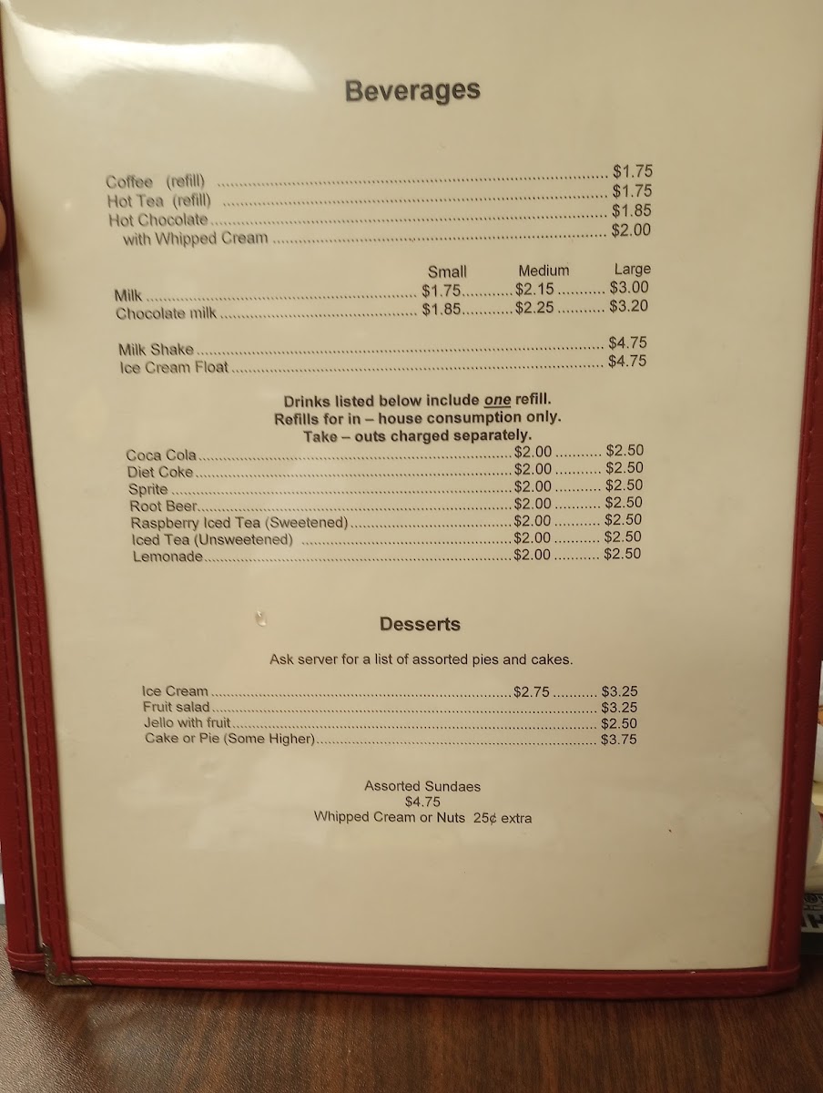 Whether you're starting the day with eggs any style paired with crispy bacon and toast, enjoying a plate of meatloaf or deep-fried haddock for lunch, or settling in for a slice of lemon meringue pie, each option echoes a sense of familiarity and uncomplicated comfort. Light but satisfying sides like homemade home fries, baked sweet potatoes, or coleslaw complement the main dishes, rounding out the experience.